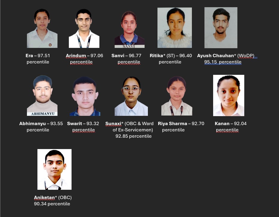 टॉप परफॉर्मर्स की सूचीः- एरा – 97.51 परसेंटाइल, अरिंदम – 97.06 परसेंटाइल, सान्वी – 96.77 परसेंटाइल, ऋतिका (ST) -96.40 परसेंटाइल, आयुष चौहान (शहीद सैनिक आश्रित) 95.15 परसेंटाइल, अभिमन्यु – 93.55 परसेंटाइल, स्वरित – 93.32 परसेंटाइल, सुनाक्षी (OBC व एक्स-सर्विसमैन की संतान) – 92.85 परसेंटाइल, रिया शर्मा – 92.70 परसेंटाइल, कनन – 92.04 परसेंटाइल, अनिकेतन (OBC) – 90.34 परसेंटाइल, वहीं वांशुल राणा (EWS व PWBD) ने 81.96 परसेंटाइल के साथ यह सिद्ध कर दिया कि शारीरिक चुनौतियाँ भी सफलता की राह में बाधा नहीं बन सकतीं। उन्हें दिव्यांग कोटे में एक अच्छे मेडिकल कॉलेज में सीट मिलने की पूरी संभावना है।