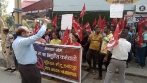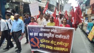 हमीरपुर/विवेकानंद वशिष्ठ :- प्रदेश 108 व 102 कर्मचारी यूनियन ( संबंधित सीटू) ने अपनी मांगों को लेकर हड़ताल की और हमीरपुर शहर में प्रदर्शन करके मुख्यमंत्री को मांगों को लेकर ज्ञापन सौंपा l पिछली रात 8 बजे से ही ये कर्मचारी एक दिन की हड़ताल पर हैं l