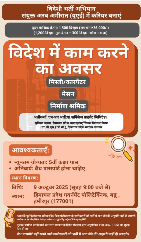 हमीरपुर/विवेकानंद वशिष्ठ :- हिमाचल प्रदेश के युवाओं को विदेशों में भी रोजगार उपलब्ध करवाने के लिए मुख्यमंत्री ठाकुर सुखविंदर सिंह सुक्खू ने एक विशेष पहल की है। उन्होंने श्रम एवं रोजगार विभाग और हिमाचल प्रदेश इलेक्ट्रॉनिक्स विकास निगम (एचपीएसईडीसी) के माध्यम से युवाओं को विदेशों में रोजगार उपलब्ध करवाने के लिए एक ऐसी योजना आरंभ की है।