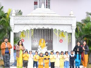 कार्यक्रम की शुरुआत बाल वाटिका–1 से कक्षा दूसरी तक के नन्हे-मुन्ने विद्यार्थियों द्वारा माँ सरस्वती की वंदना एवं मंत्रोच्चारण से हुई। पीले वस्त्रों में सजे बच्चों की मासूम प्रस्तुतियों ने पूरे वातावरण को भक्तिमय बना दिया।
