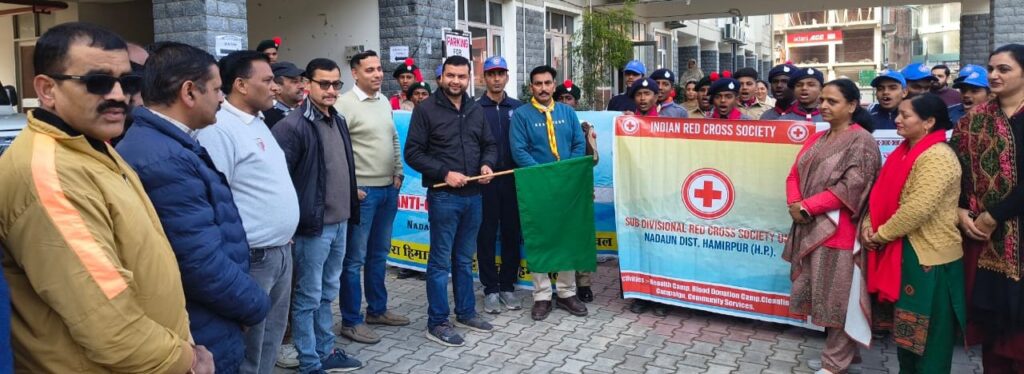 नादौन/हमीरपुर:- रैडक्रॉस सोसाइटी की उपमंडल इकाई ने मंगलवार को यहां विभिन्न शिक्षण संस्थानों एवं अन्य संस्थाओं के सहयोग से चिट्टा विरोधी रैली निकाली और उसके बाद ऐतिहासिक एवं धार्मिक स्थल ध्यानू भक्त की समाधि तथा इसके आस-पास के क्षेत्र में सफाई अभियान चलाया।