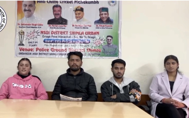 शिमला:- जिला अध्यक्ष हार्दिक भंडारी के नेतृत्व में NSUI जिला शिमला द्वारा आयोजित प्रेस कॉन्फ्रेंस में “एंटी चिट्टा महाकुंभ” को लेकर युवाओं को जागरूक करने और नशा मुक्त समाज बनाने का संदेश दिया गया।