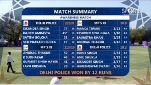 रोमांचक मुकाबले में दिल्ली पुलिस की टीम ने सांसदों की टीम को 12 रनों से हराकर ट्रॉफी अपने नाम की। टॉस हारकर पहले बल्लेबाजी करते हुए दिल्ली पुलिस ने 20 ओवर में 225 रन बनाए।