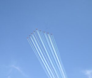 एयर शो के प्रथम दिन की समाप्ति से पहले एरोबेटिक टीम ने शहीद विंग कमांडर नमांश स्याल के सम्मान में आकाश में एक विशेष फॉर्मेशन बनाकर उन्हें नमन किया।
