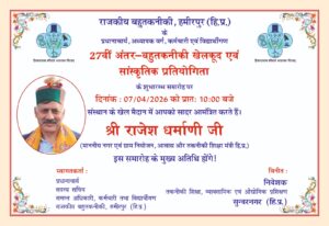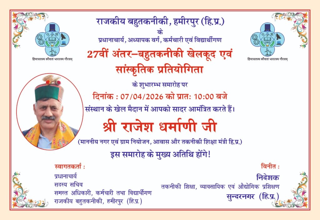 हमीरपुर/विवेकानंद वशिष्ठ:- बहुतकनीकी महाविद्यालयों की 27वीं राज्य स्तरीय एथलेटिक्स एवं सांस्कृतिक प्रतियोगिता 7 से 9 अप्रैल तक बड़ू स्थित राजकीय बहुतकनीकी महाविद्यालय हमीरपुर में आयोजित की जा रही है।