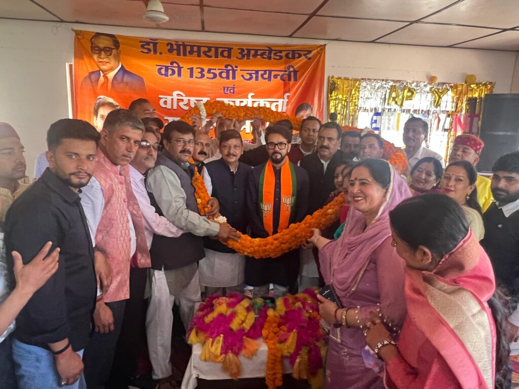 हमीरपुर/विवेकानंद वशिष्ठ:- पूर्व केंद्रीय मंत्री और हमीरपुर के सांसद अनुराग सिंह ठाकुर ने आज सुजानपुर विधानसभा क्षेत्र के लग कढ़ियार स्थित अम्बेडकर भवन में डॉ. भीमराव अम्बेडकर की 135वीं जयंती के अवसर पर भाजपा के वरिष्ठ कार्यकर्ताओं को सम्मानित किया।